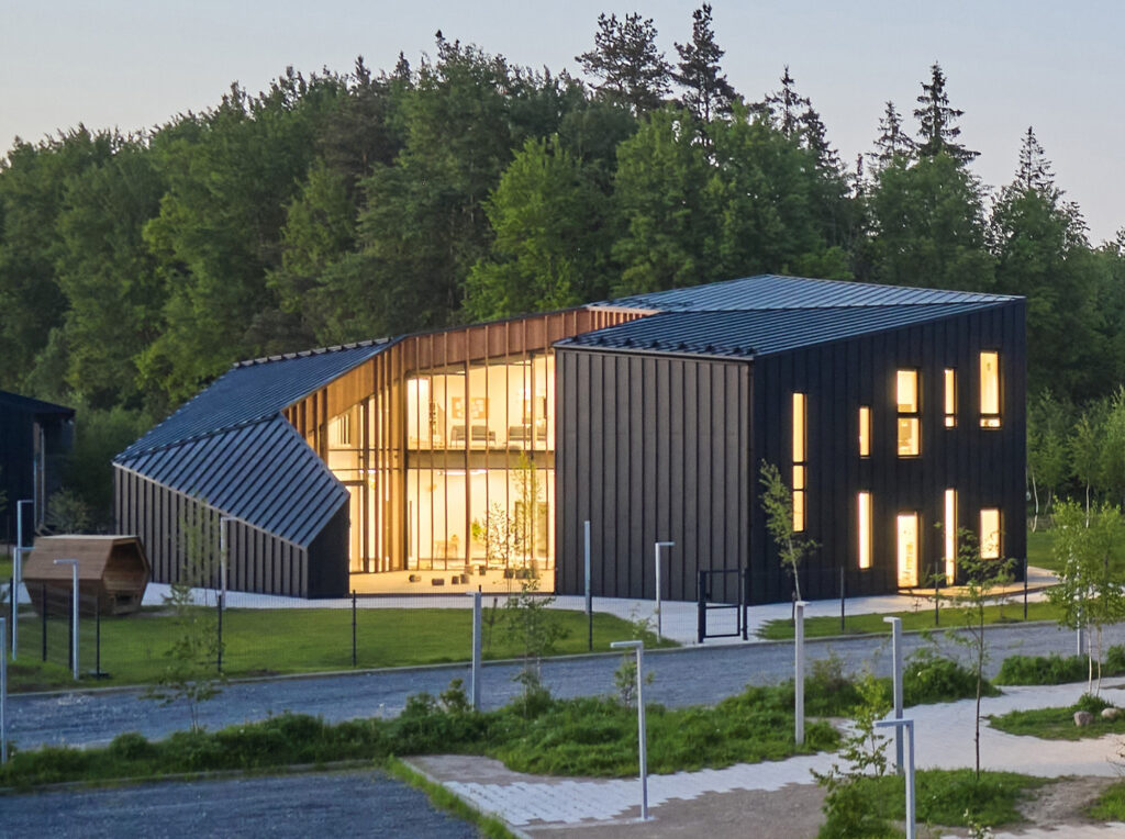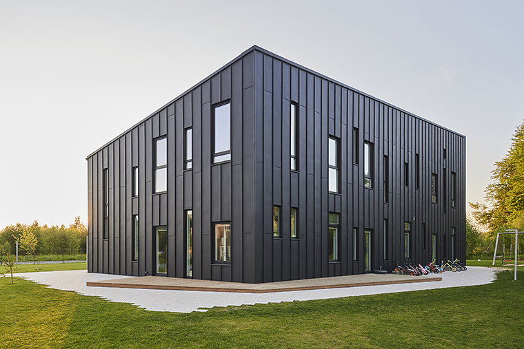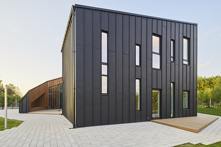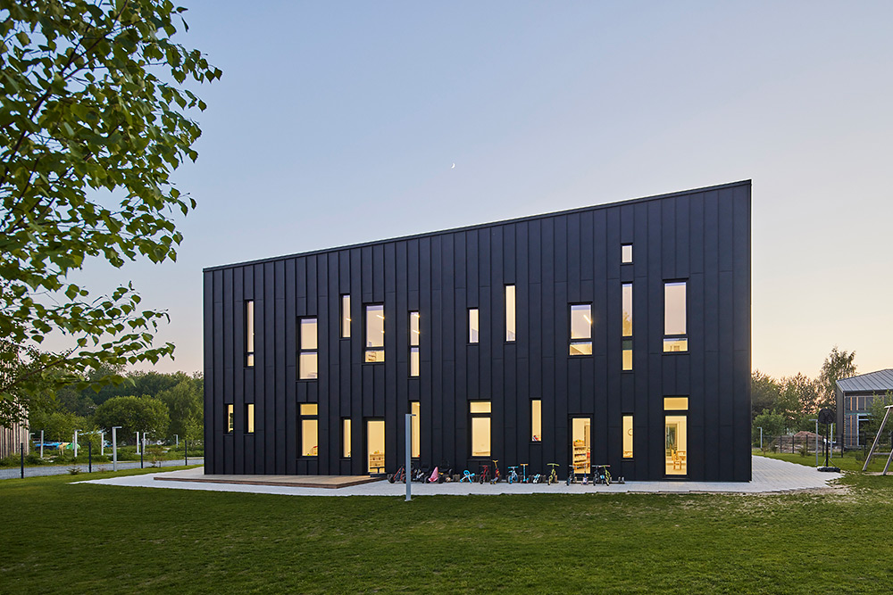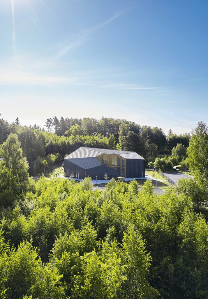 The kindergarten is defined by a dynamic, sculptural volume that distinguishes it within the larger development. The composition is compact yet expressive, balancing strong geometric clarity with carefully articulated openings. Dark exterior cladding creates a pronounced contrast against the surrounding forest, allowing the building to stand out while still remaining grounded within its natural context. The massing responds to both functional requirements and the scale of children, creating a structure that is readable, welcoming, and visually engaging.