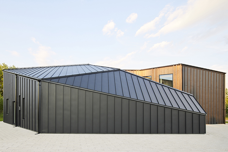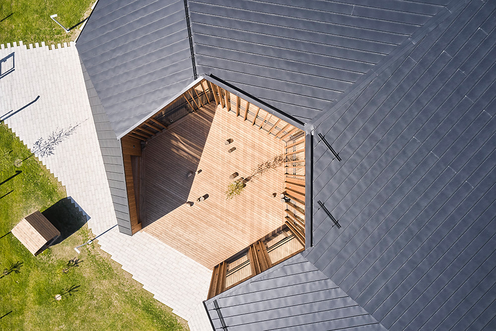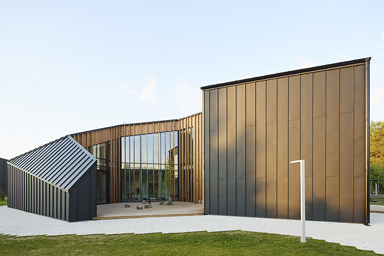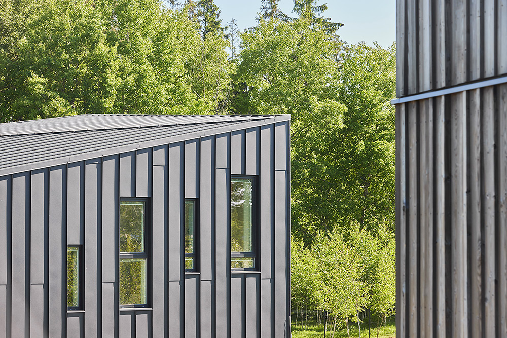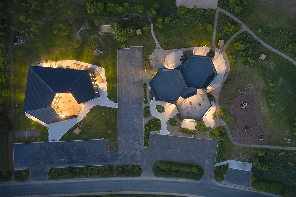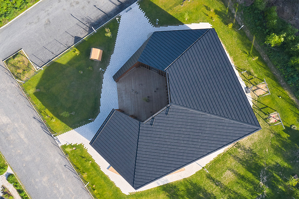 The kindergarten is defined by a dynamic, sculptural volume that distinguishes it within the larger development. The composition is compact yet expressive, balancing strong geometric clarity with carefully articulated openings. Dark exterior cladding creates a pronounced contrast against the surrounding forest, allowing the building to stand out while still remaining grounded within its natural context. The massing responds to both functional requirements and the scale of children, creating a structure that is readable, welcoming, and visually engaging.