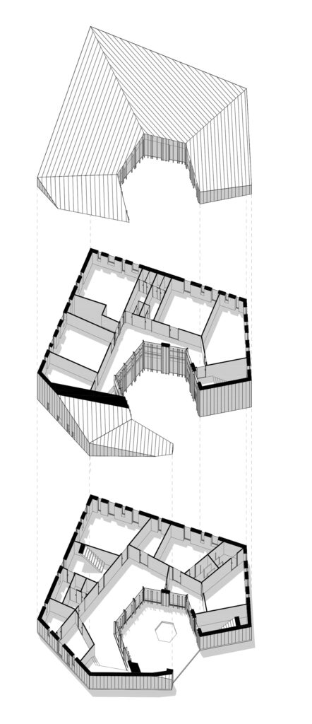 The diagrams illustrate the relationship between classrooms, courtyard, and circulation, revealing the clear spatial logic behind the building’s compact form.