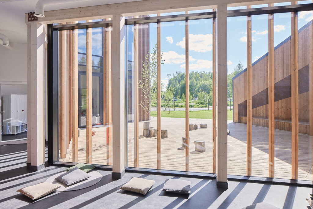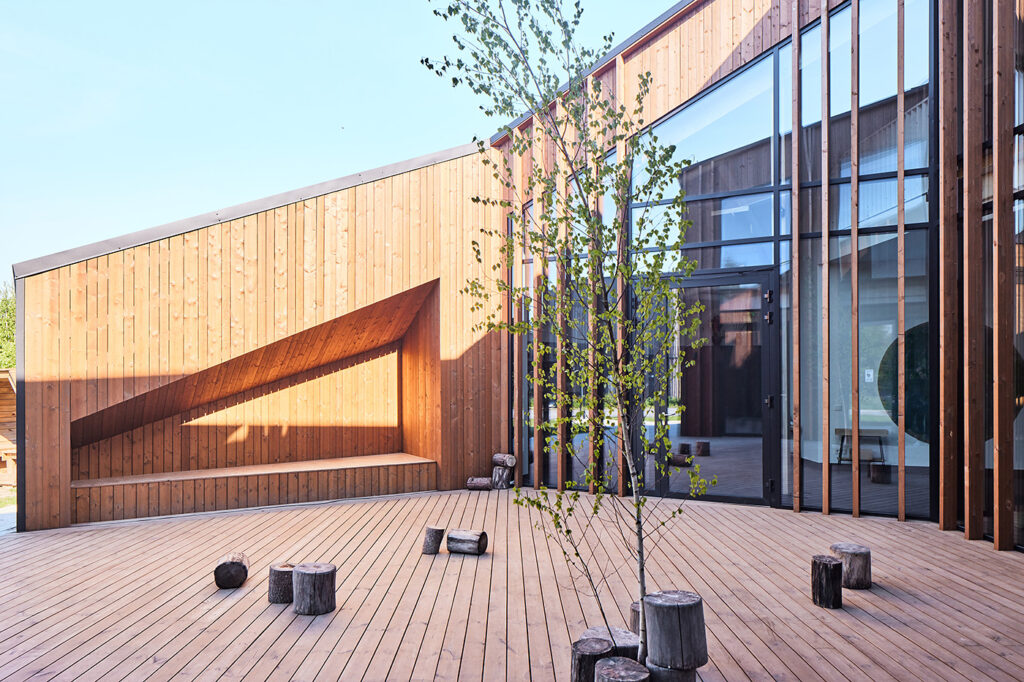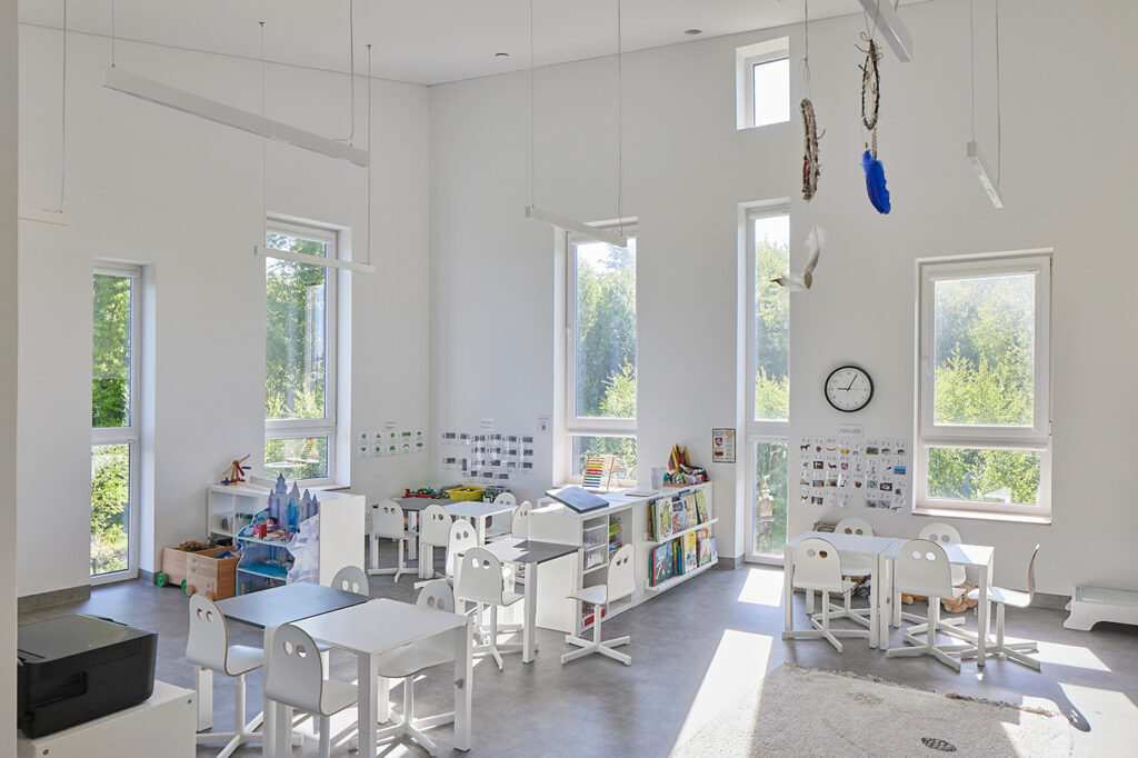 Located alongside mature birch and pine trees, the kindergarten occupies a carefully selected site where built form meets untouched landscape. This proximity to the forest defines both the atmosphere and the architectural response. As part of a broader network of educational and public buildings, the kindergarten sits at the heart of the development while remaining visually and spatial connected to nature. The surrounding greenery provides calmness, seasonal variation, and a constant visual dialogue between interior spaces and the outdoors.