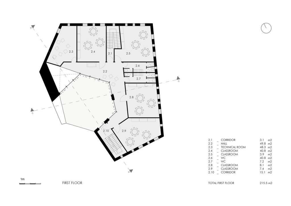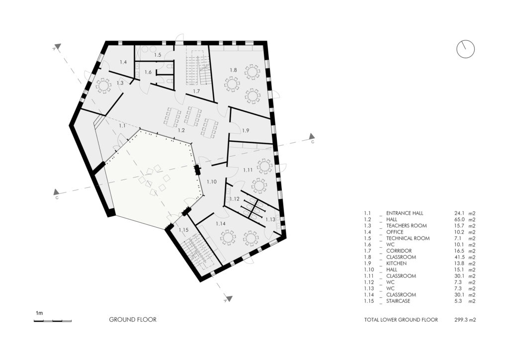 With a total area of 557 square meters, the kindergarten accommodates seven classrooms, including two specifically designed for very young children. The plan allows for a clear separation between quieter learning zones and more active shared spaces. Two independent entrances enable parts of the building to function autonomously, providing flexibility, privacy, and controlled access. This organization supports both the daily routines of children and the operational needs of staff, ensuring clarity and ease of movement throughout the building.