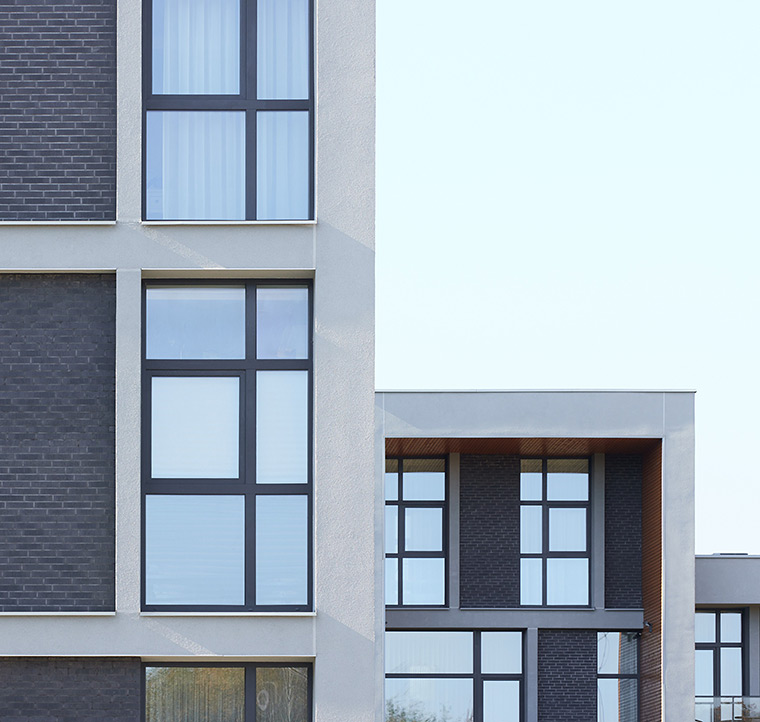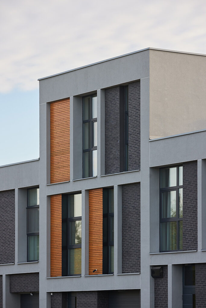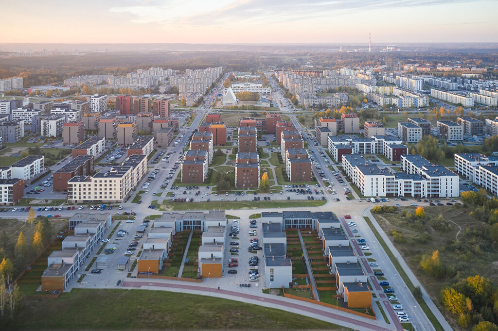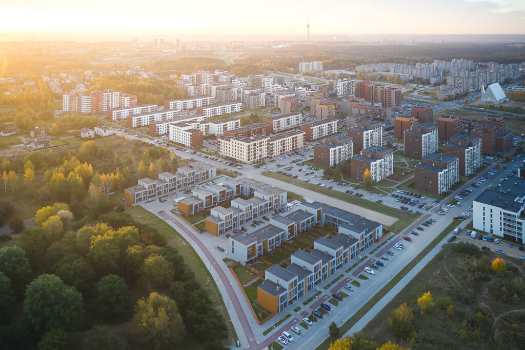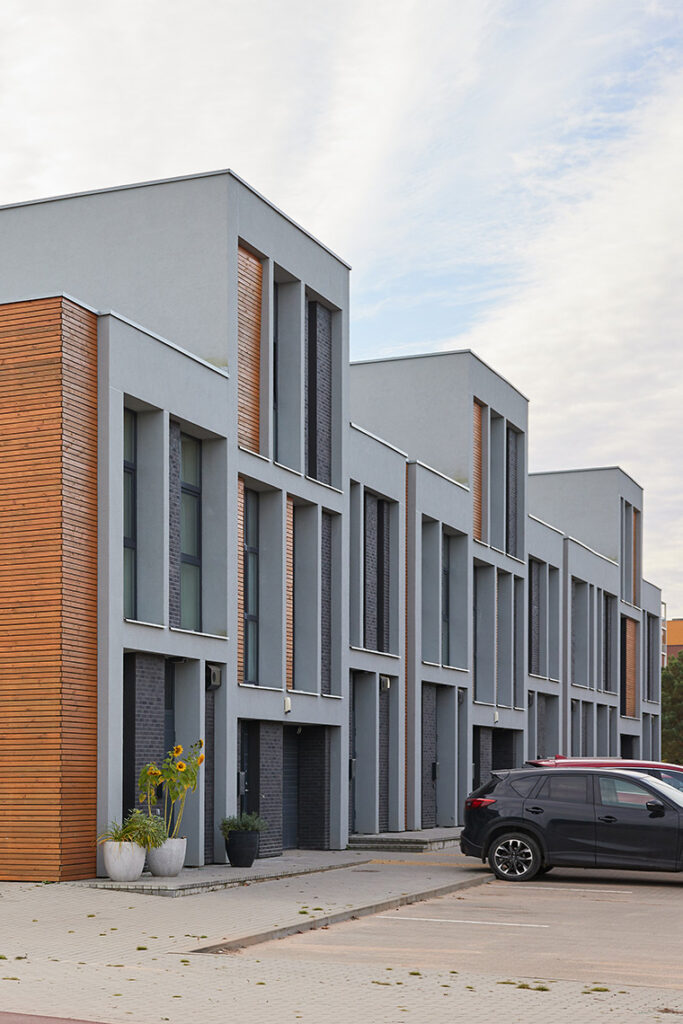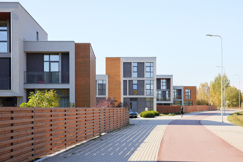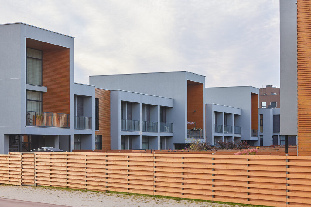 Located within a developing residential district of Vilnius, the site is characterized by low-rise housing, generous green areas, and a suburban scale. The project responds to this context by maintaining a moderate building height and a clearly defined urban edge, while opening inward toward protected courtyards. This strategy allows the development to integrate naturally into its surroundings while offering residents a sense of enclosure, privacy, and community.