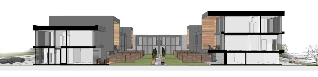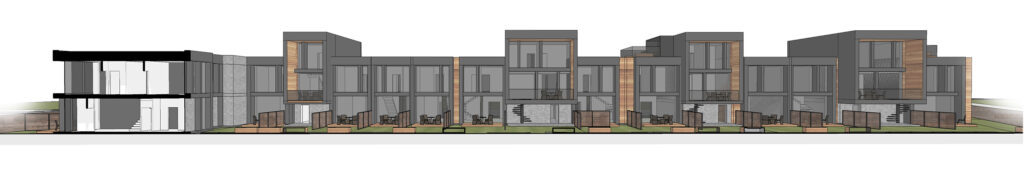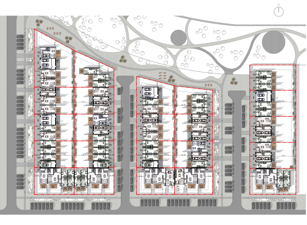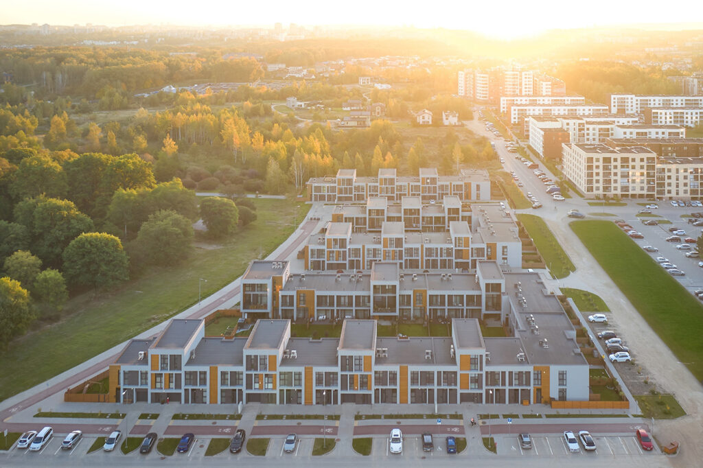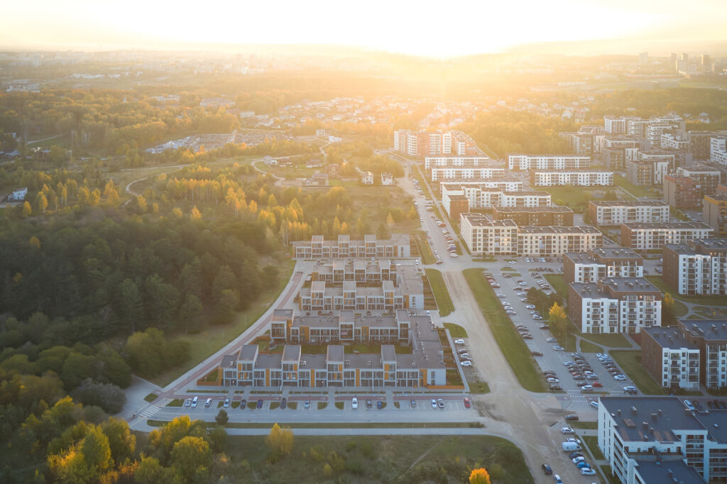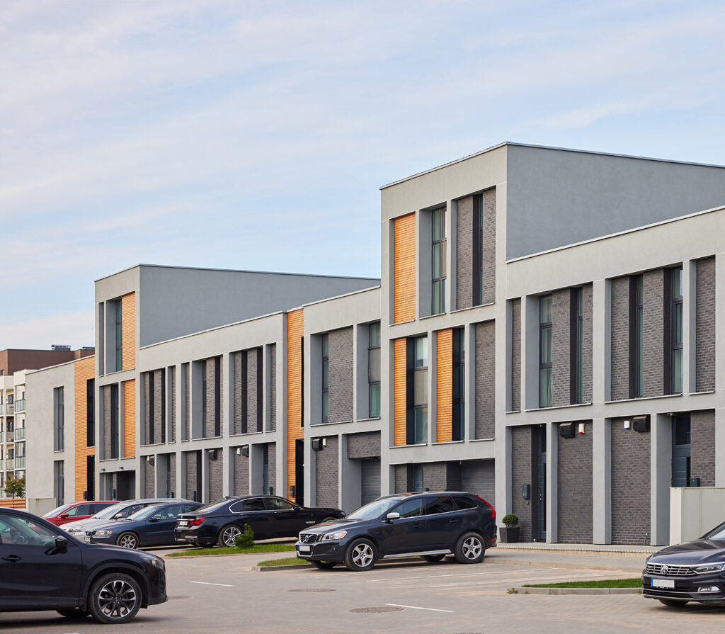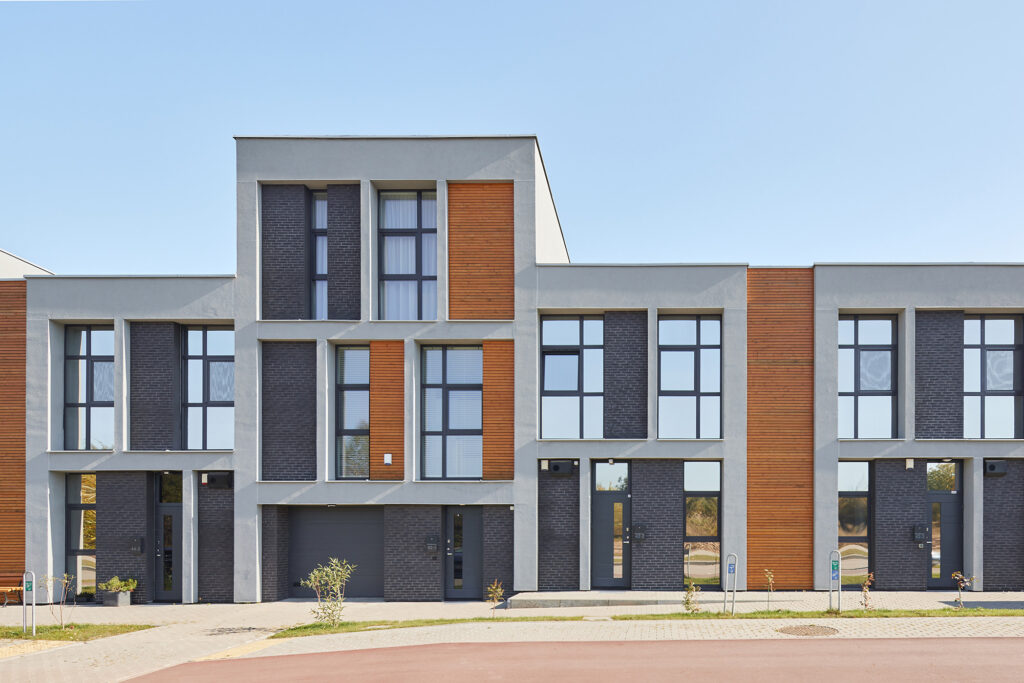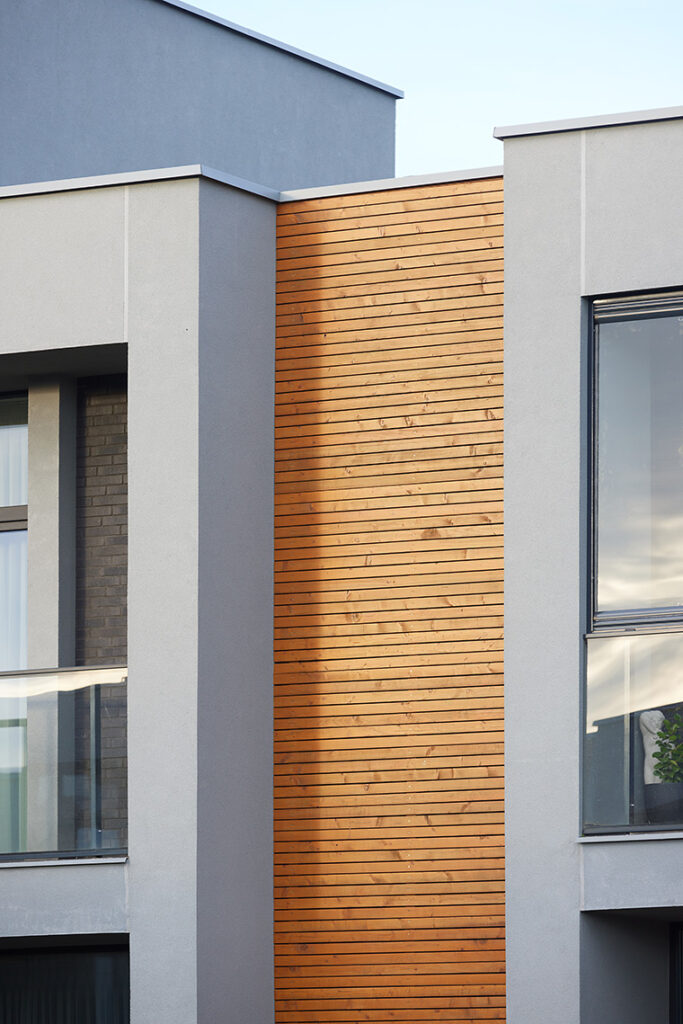 Located within a developing residential district of Vilnius, the site is characterized by low-rise housing, generous green areas, and a suburban scale. The project responds to this context by maintaining a moderate building height and a clearly defined urban edge, while opening inward toward protected courtyards. This strategy allows the development to integrate naturally into its surroundings while offering residents a sense of enclosure, privacy, and community.