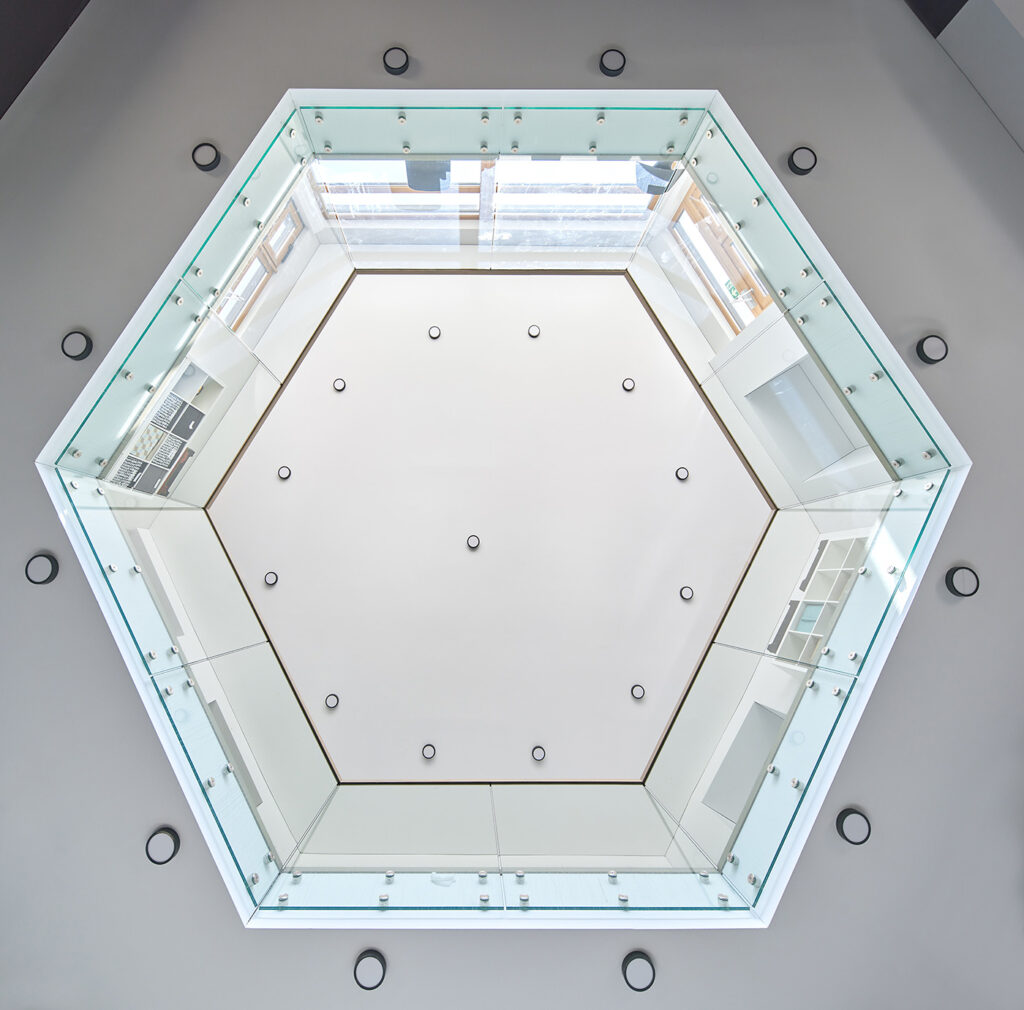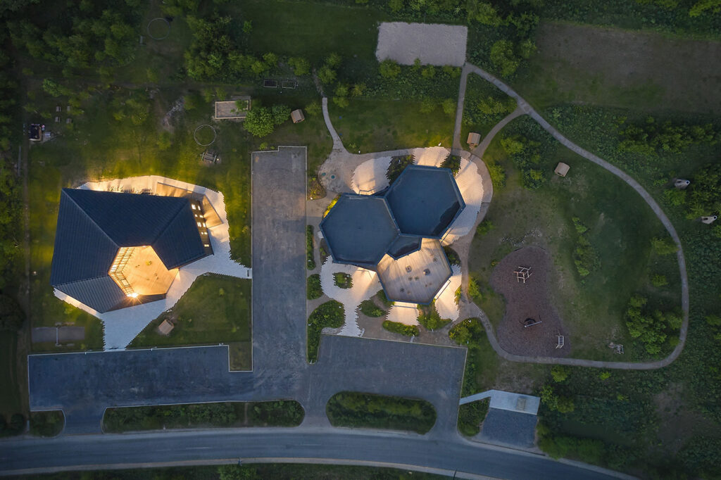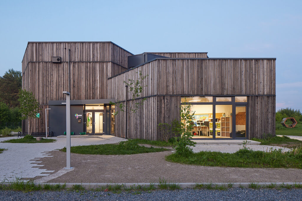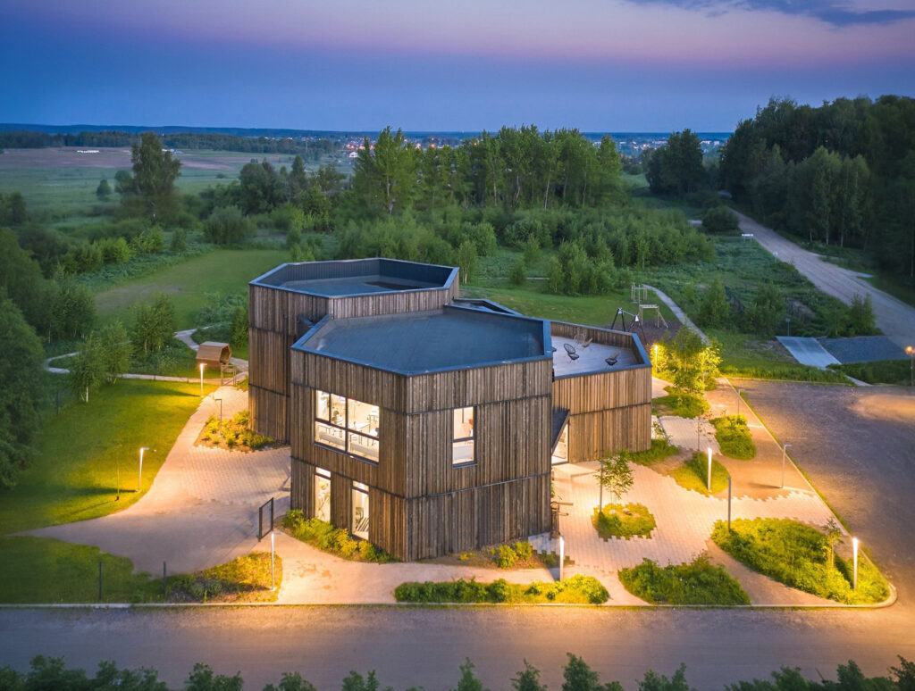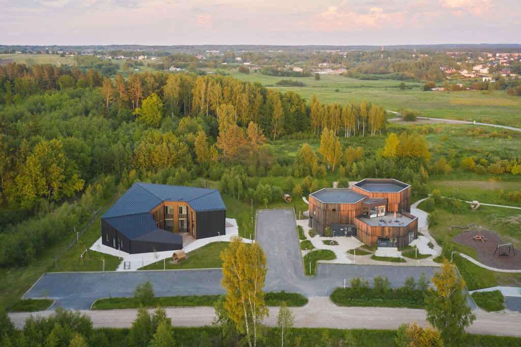 The architecture of the villa takes its clues from the horizontal lines of the landscape: the river with the woods in the background on its both sides.