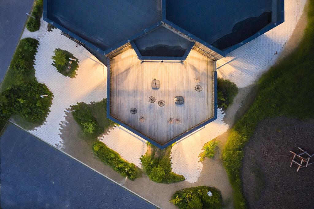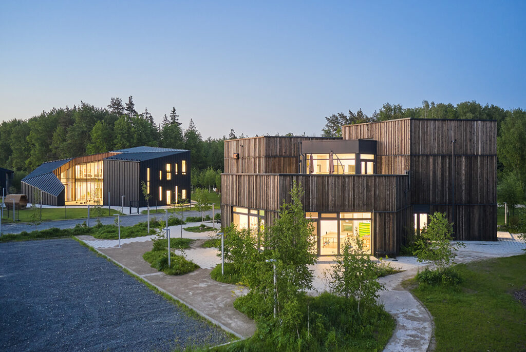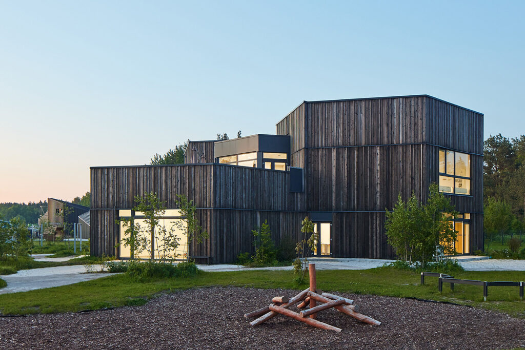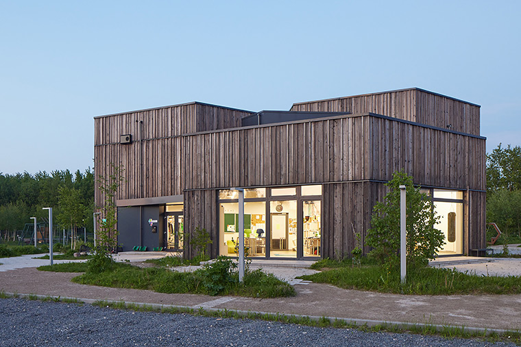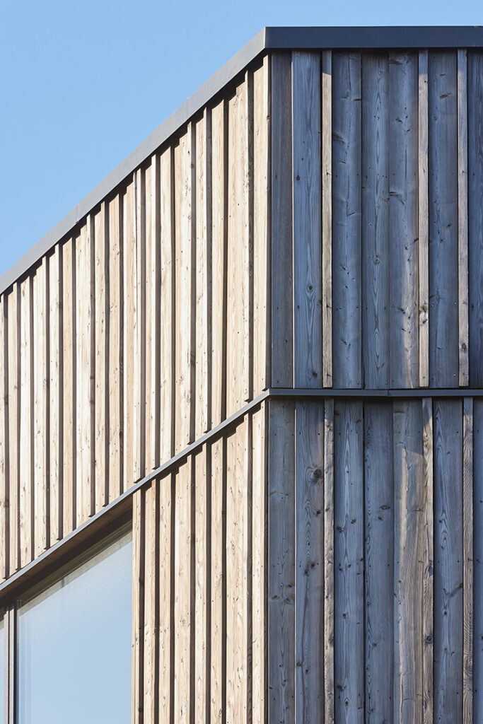 The architecture of the villa takes its clues from the horizontal lines of the landscape: the river with the woods in the background on its both sides. The villa is therefore designed in three long white horizontal planes that almost seem to be floating due to the neutral black wall tiles that blend to the dark woods behind the house. The South facade is designed with vertical timber slates in betwee black wall tiles that blend to the dark woods behind the house. The South facade is designed with vertical timber slates in between the glazing that he South facade