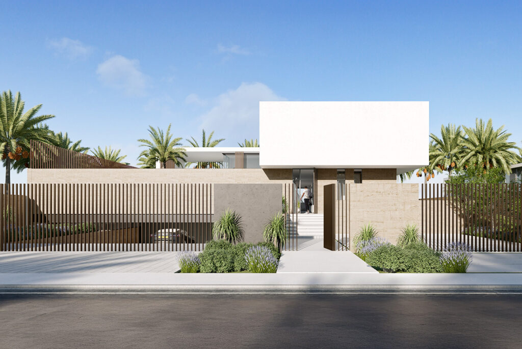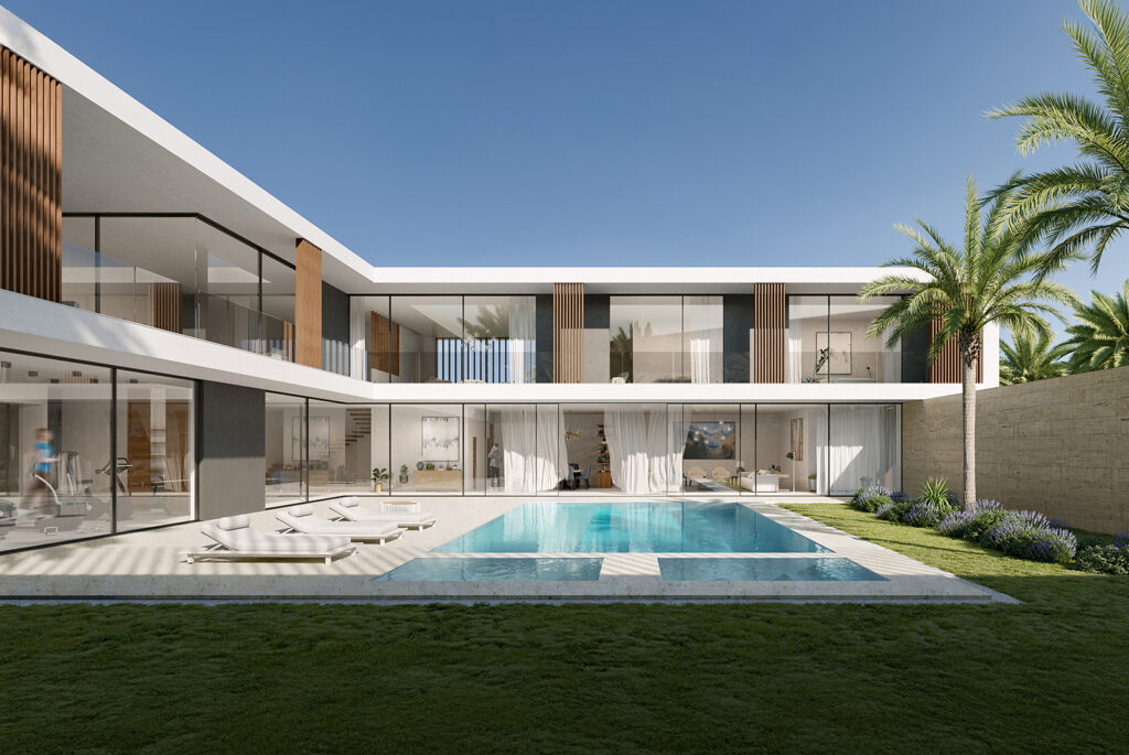 The architecture of the villa takes its clues from the horizontal lines of the landscape: the river with the woods in the background on its both sides.