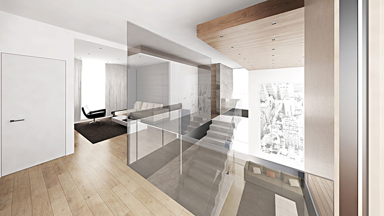 The architecture of the villa takes its clues from the horizontal lines of the landscape: the river with the woods in the background on its both sides. The villa is therefore designed in three long white horizontal planes that almost seem to be floating due to the neutral black wall tiles that blend to the dark woods behind the house. The South facade is designed with vertical timber slates in betwee black wall tiles that blend to the dark woods behind the house. The South facade is designed with vertical timber slates in between the glazing that he South facade