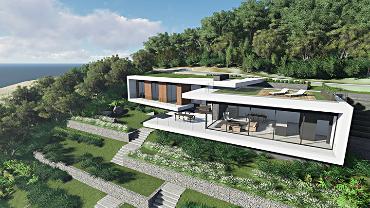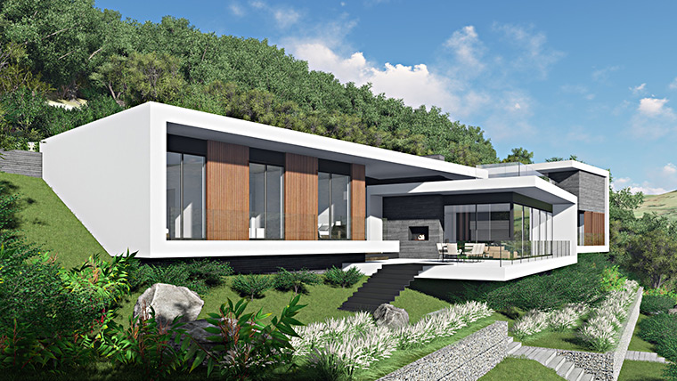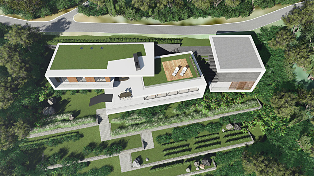 The architecture of the villa takes its clues from the horizontal lines of the landscape: the river with the woods in the background on its both sides.